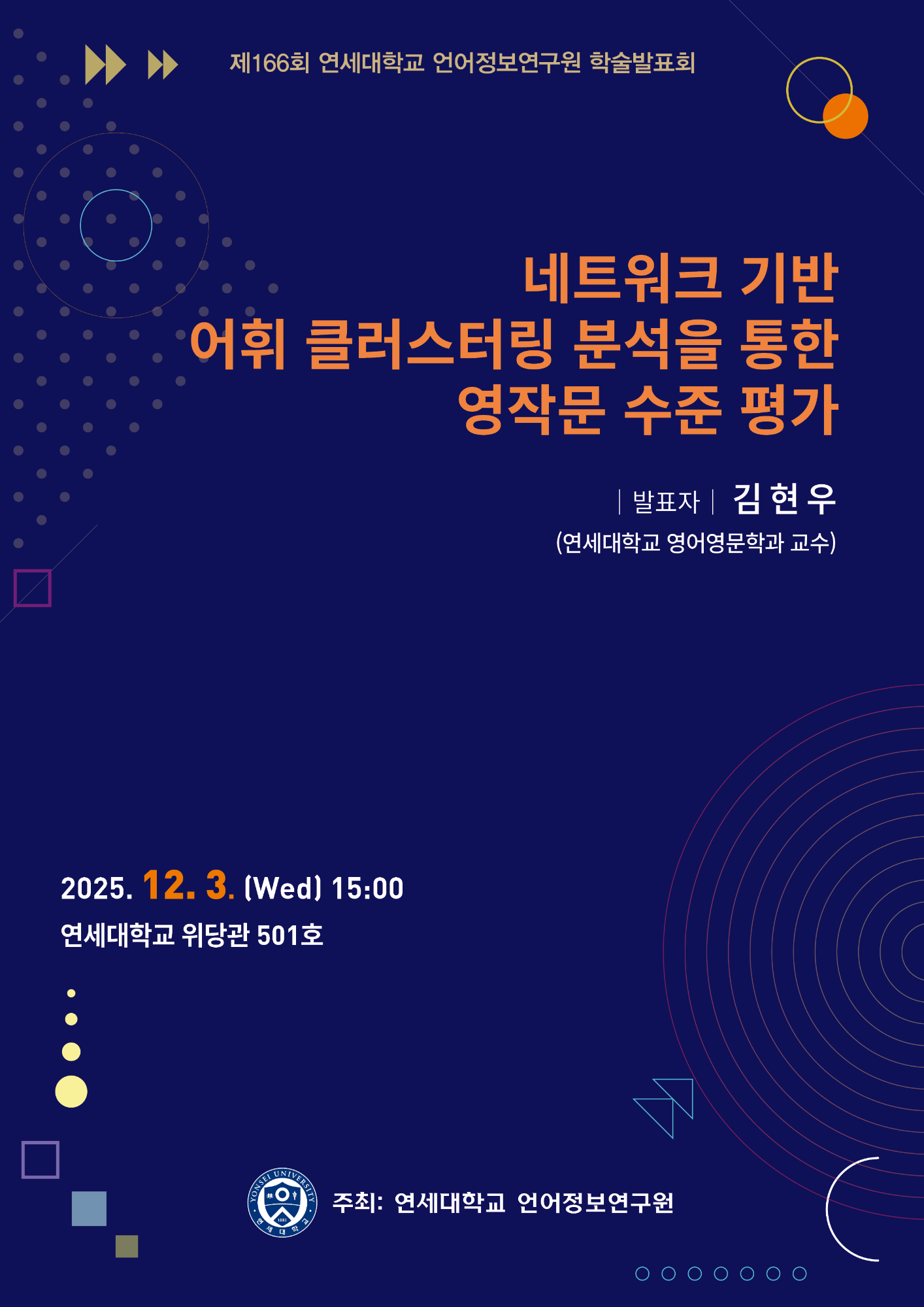 ¿¬¼¼´ëÇб³ ¾ð¾îÁ¤º¸¿¬±¸¿ø¿¡¼ 12¿ù 3ÀÏ(¼ö) ¿ÀÈÄ 3½Ã ±èÇö¿ì ¿¬¼¼´ëÇб³ ¿µ¾î¿µ¹®Çаú ±³¼ö´ÔÀ» ¸ð½Ã°í '³×Æ®¿öÅ© ±â¹Ý ¾îÈÖ Å¬·¯½ºÅ͸µ ºÐ¼®À» ÅëÇÑ ¿µÀÛ¹® ¼öÁØ Æò°¡'¶ó´Â ÁÖÁ¦·Î Á¦166ȸ Çмú¹ßǥȸ¸¦ °³ÃÖÇÏ¿© ¾È³»µå¸³´Ï´Ù.